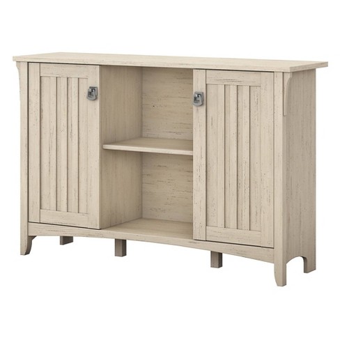 Salinas rustic oak storage cabinet. Inspired by timeless mission style this 32w x 16d x 63h tall storage cabinet features tapered legs curved base rails and decorative wood accents that blend seamlessly with farmhouse and cottage decor. The bush furniture salinas accent storage cabinet with doors blends unique details and adjustable features for use in a variety of spaces. A wall anchor kit is included to prevent tipping injuries and keep your family safe. Complete your home office hallway entryway or living room with a casual two door cabinet featuring open and concealed storage.