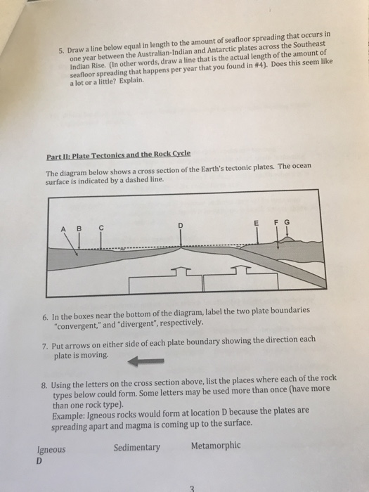 Seafloor spreading occurs at which type of plate boundary. Scientists recognize three common types of boundaries between these moving plates. What type of boundary occurs where two plates move together causing one plate to descend into the mantle beneath the other plate. Along mid ocean ridges. What did scientist use to prove the the seafloor was spreading apart.